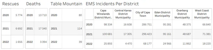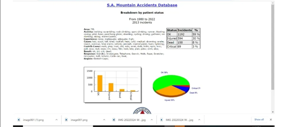 According to the SAMA database, 158 people died on Western Cape mountains between 1980 and 2022, and 594 were injured. These include Table Mountain, Lion’s Head, Cape Peninsula mountains, Groot Drakenstein, Du Toitskloof Mountains, Hex River Mountains, Groot Winterhoek Mountains, Riviersonderend Mountains, Langeberg, Cederberg and others.