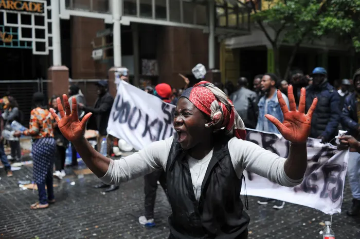 A woman is holding up her hands during a protest. Her hands are red from the water police used in the Water tank after chaos erupted outside the UN High Commissioner for Refugees (UNHCR) offices at Waldorf Arcade.Picture: Henk Kruger/African News Agency (ANA)