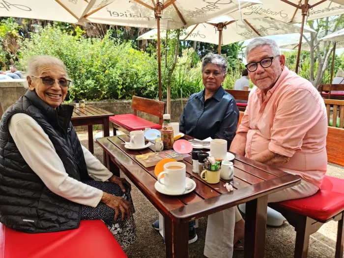 Blanche La Guma celebrated her 95th birthday with friends at Kirstenbosch National Botanical Garden in Newlands on Wednesday. Seen with her are Dr Bonita Bonnet, former director of the District Six Museum and Prof Andre Odendaal. Picture: Supplied.