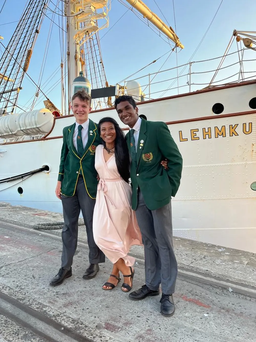 Saphira Shaik and Mpilwenhle Langa, both aged 15, share a picture with their teacher on the historical “Statsraad Lehmkuhl” ship. Picture: Supplied