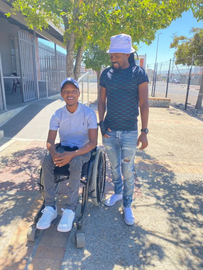 A man standing next to another man in a wheelchair in a courtyard, both of them smiling. Sisa Makaula, the founder of the Makaula foundation in Delft, with the man who rushed him to hospital and saved his life. Picture: SUPPLIED