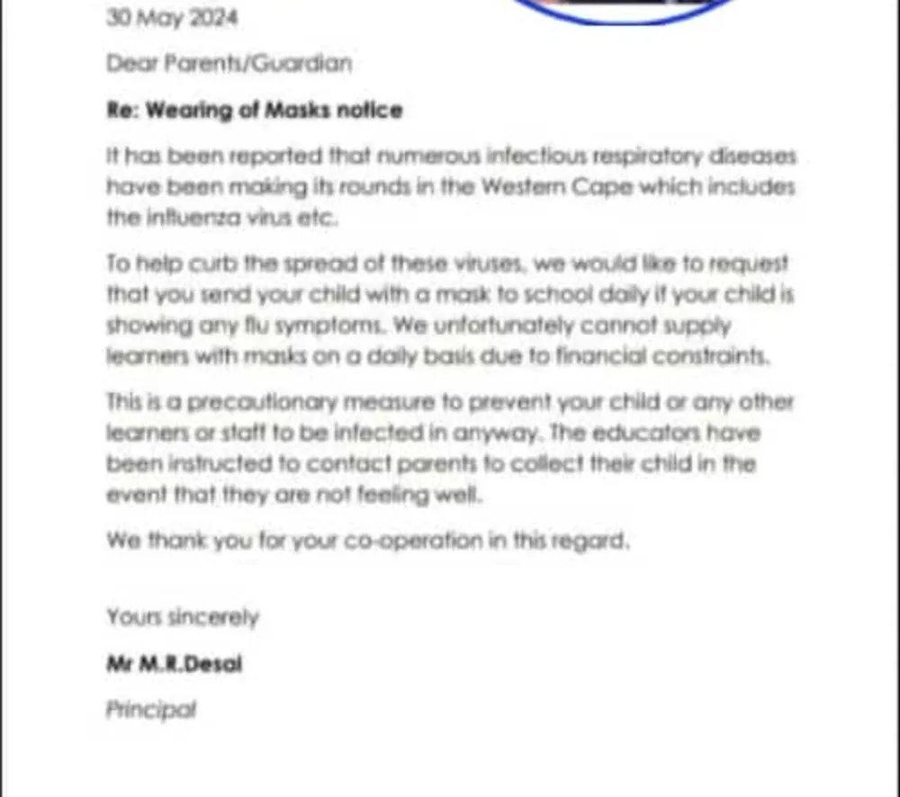 “The school has advised that they took the initiative to recommend that children with flu symptoms wear a mask as a precautionary measure, because exams are coming up and they don't want learners to get sick and miss exams. No learner will be sent home for not wearing a mask.”