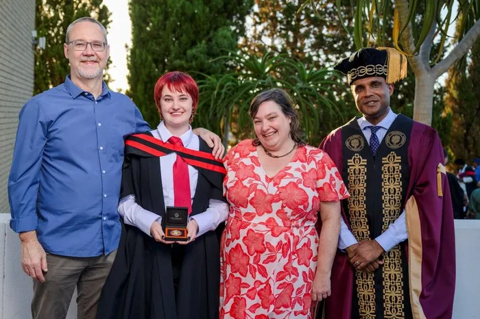 Dr Owen Porrill (father); Kerry Porrill, Dr Michelle Meiring (mother) and Prof Deresh Ramjugernath, Rector and Vice-Chancellor.
