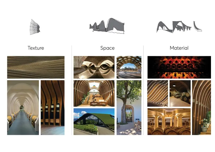 Architecs drawing: Materiality and detailing draw on the language of traditional Cape wineries and cellars, expressed through a refined contemporary approach. A carefully considered palette of textures, colours, and natural materials is complemented by the integration of indigenous planting and vineyard landscapes, reinforcing a strong connection between the built environment and its setting.
