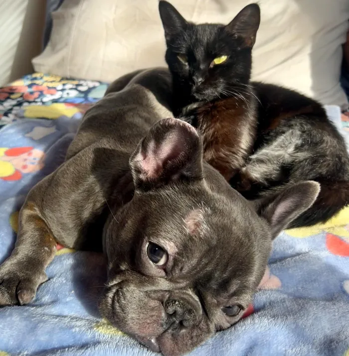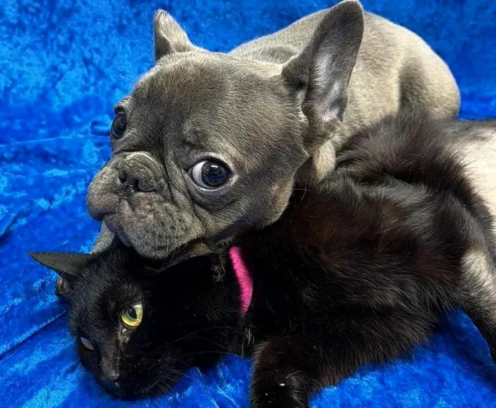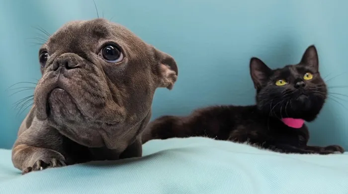 Blueberry, a French bulldog mix, and Meadow, a black cat.