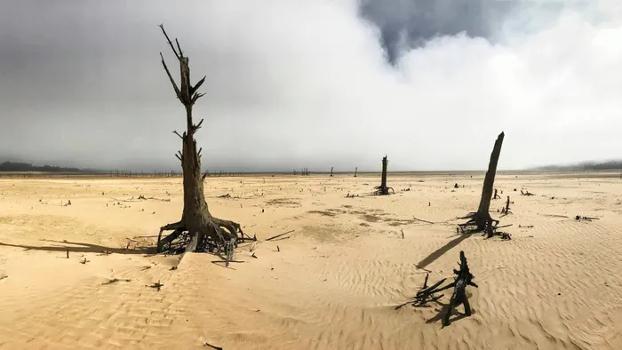Can a repeated scenario be expected? A portion of the Theewaterskloof dam, close to empty in 2018, showing tree stumps and sand usually submerged by the water of the dam.