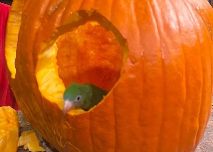 Bebe explores a pumpkin.