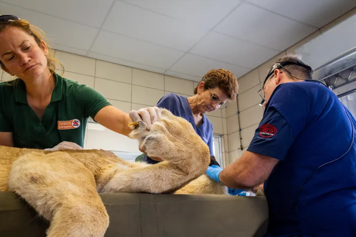 LIONSROCK vet Christine Steyrer, Professor Gerhard Steenkamp and his assistant Michelle Cruywagen during dental procedure of lioness Khawla at LIONSROCK Big Cat Sanctuary in Bethlehem, South Africa.