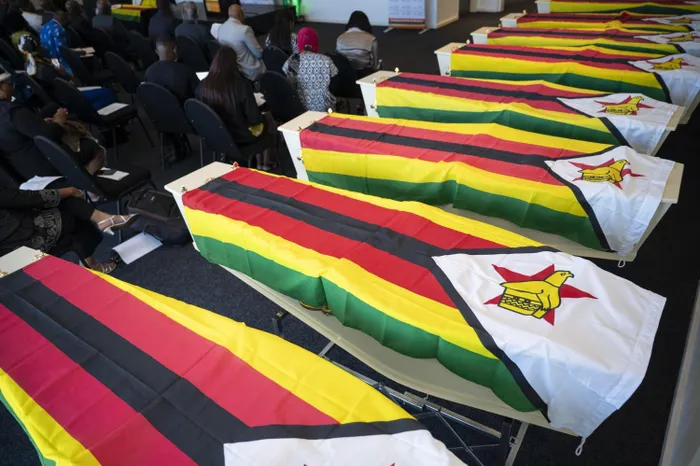 The human remains in the coffins draped with Zimbabwean flags that will be repatriated and reburied in Zimbabwe.