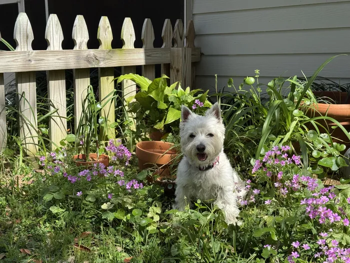 Marlie the Westie moves her food onto the mat under her bowl before eating it.