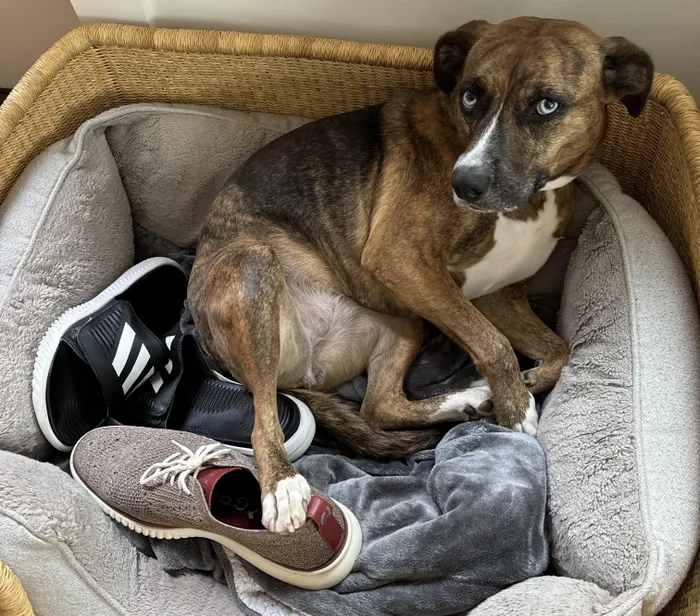 When a dog like Fae steals a shoe to her bed, she isn't being naughty; she is writing a love letter to her owner’s scent. Because dogs are primarily driven by olfaction, shoes serve as high-intensity "scent sponges" of their favourite human. While humans might find a well-worn sneaker pungent, a dog’s brain associates that concentrated aroma with safety and affection. This behaviour typically peaks when owners are away, as the dog seeks a physical reminder of its "pack" to soothe separation anxiety.