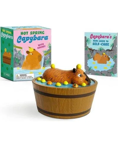 Enjoy a quiet moment with this one-of-kind palm-sized capybara collectible. One-of-a-kind collectible: A "2¾ inch inch tall collectible of hot spring tub with an adorable capybara inside. With relaxing sounds. Enjoy soothing hot spring sounds when the capybara is pushed down into its tub Mini book included: Learn more about this water loving rodent in the 32-page, 2¾ inch mini book. A unique Gift: A perfect humorous gift for those who love capybaras. Includes button cell batteries.