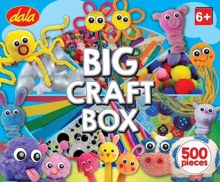 The Dala Big Craft Box features over 500 pieces of various craft materials including an instruction sheet showing you how to create little stunning craft items. Includes: pom poms, chenille stems, wooden craft sticks and pop sticks, glue, scissors, googly eyes, dough, fun foam, paints, brushes, bells, beads, felt, EVA sheets and more.